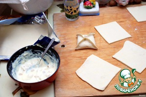 На серединку квадратика кладем начинку и защепляем края, как на фото.