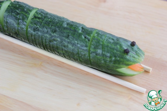 Второй огурец положить на две палочки для суши и надрезать не прорезая огурец, вырезать мордочку змейки, вставить язычок из морковки или кожицы помидора. -