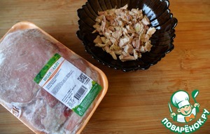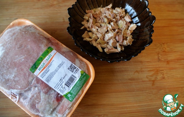 Для приготовления салата берём филе индейки. У меня - филе бедра индейки Индилайт. Заливаем необходимое количество филе водой, доводим до кипения, снимаем пену и варим в подсоленной воде до готовности около 40 минут на слабом огне. В конце добавляем любимую приправу. У меня - универсальная приправа для птицы. Готовому филе даём остыть, режем мелкими кусочками.