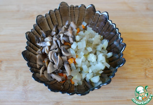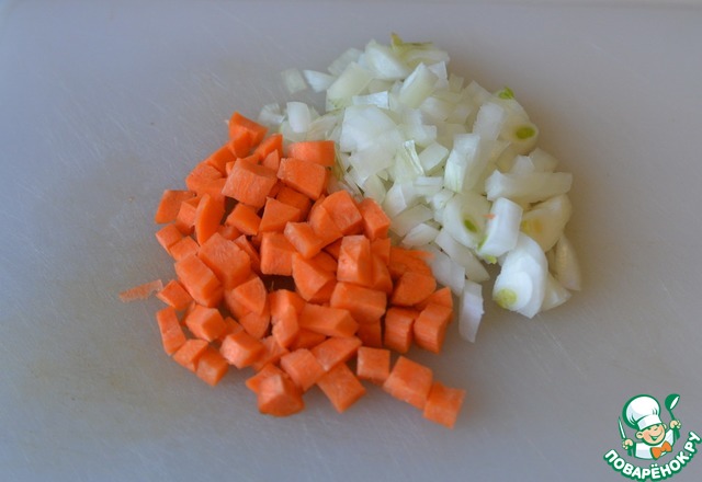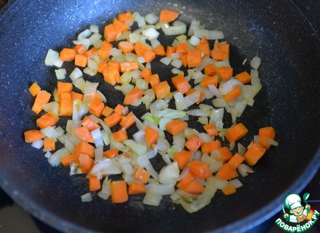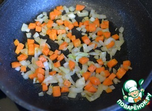 На горячую сковороду наливаем растительное масло. Кладём лук и морковь и обжариваем на среднем огне: лук до мягкости и морковь до полу-мягкости (около 10 минут). Добавляем соль, молотый чёрный перец.