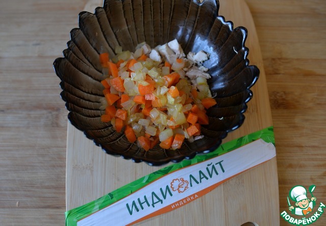 Даём луку с морковью остыть, добавляем в салатницу к индейке.