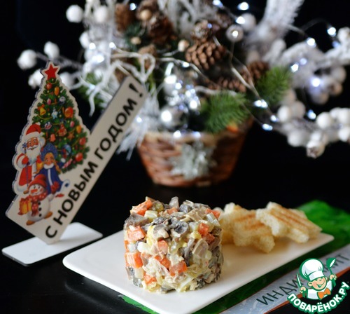 Украшаем салат по желанию. Я сделала порционную подачу с помощью кулинарного кольца, а к салату сделала "звёзды" из тостового хлеба и подсушила их на гриле.