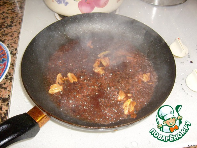 После того, как крылышки выложили на тарелку, в эту же сковородку кладем чеснок и поджариваем его немного, потом добавляем вино.