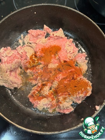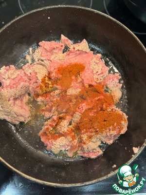 Обжарить на оливковом масле фарш, посолить, поперчить, добавить паприку