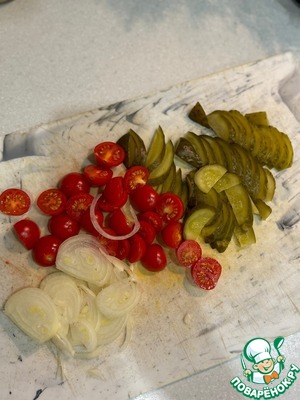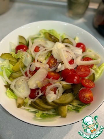 От себя скажу, лук я мариновала уксус, соль сахар, побоялась, если горький лук попадется дети откажутся кушать. И заправку заменила на готовый майонезный соус бургер, тоже спешила к столу поставить.