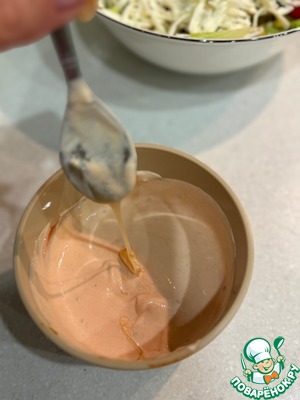 Приготовить секретную заправку: соединить все ингредиенты для заправки и перемешать в однородный соус
