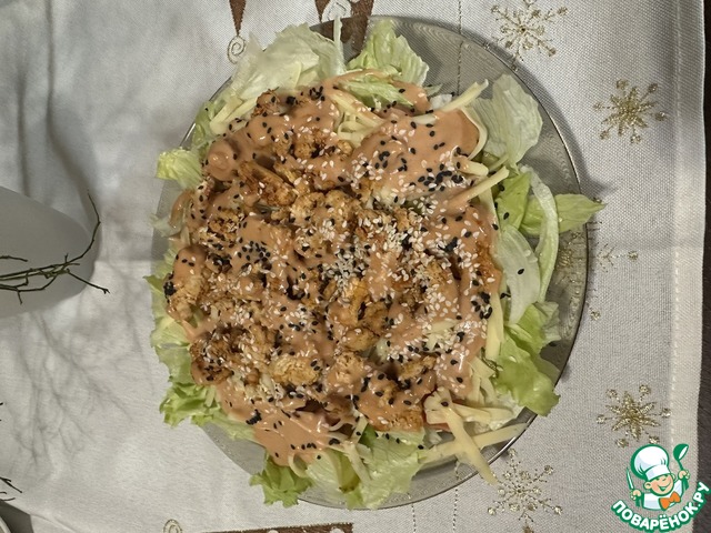 Заправить салат соусом, перемешать, сверху можно украсить кунжутом и смело подавать на стол.