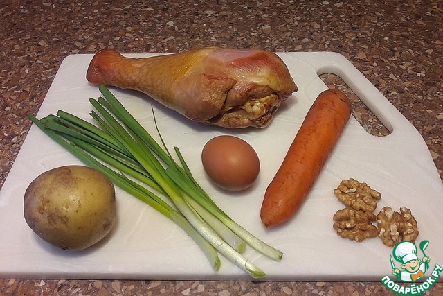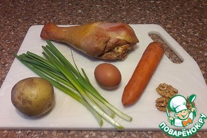 Сварить овощи и яйца. Промыть лук. Орехи промыть и просушить