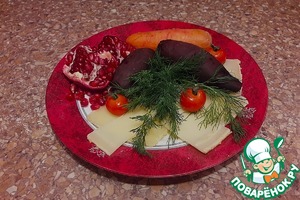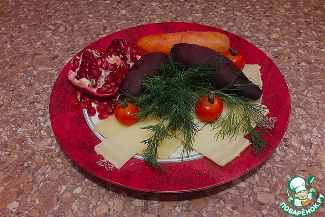Для украшения понадобились: сыр твердый, укроп, свекла и морковь отварные, помидоры черри, зерна граната