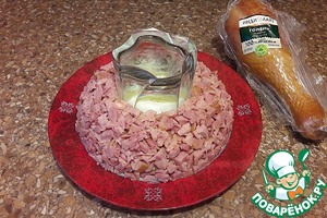 На тарелку ставим стакан, и вокруг стакана укладываем слои салата.