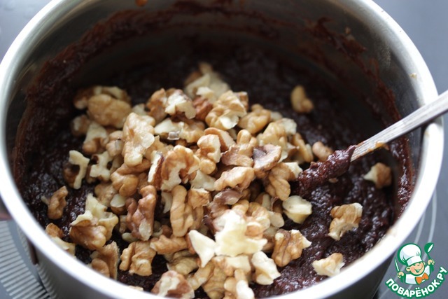 Добавить в шоколадную смесь рубленые орехи и перемешать.