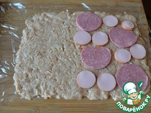 Сверху на фарш кладём любые колбасные изделия, которые имеются в холодильнике, можно их ассорти. У меня - сардельки и копчёная колбаса. Колбасные изделия можно нарезать тонкими слайсами, порезать кубиками или полосками.