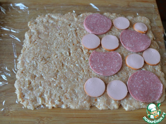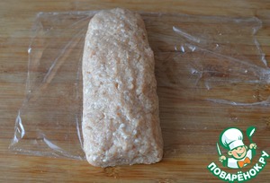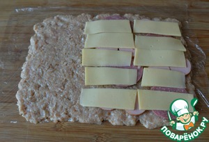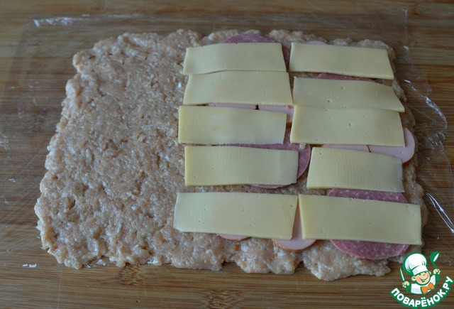 На доску кладём пищевую плёнку. На плёнку кладём фарш и руками распределяем его в виде прямоугольника толщиной около 1,5 см.