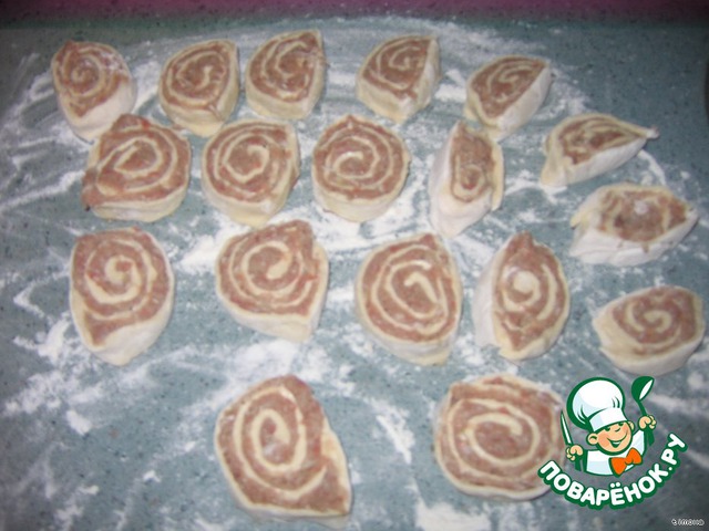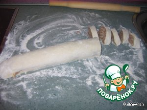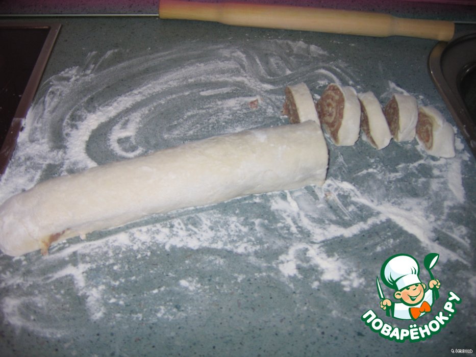 Тесто раскатываем довольно тонко мм 2-3, выкладывам на него фарш, сворачиваем в рулет