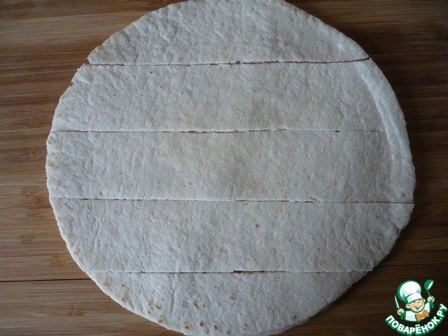 На ветчину выложите еще одну лепешку тортильи (чтобы ломтики ветчины и сыра находились между двумя тортильями), затем разрежьте их на полоски.