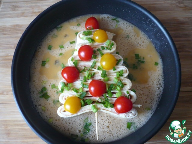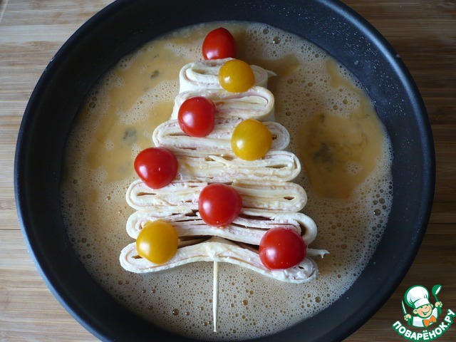 Положите приготовленную "рождественскую ёлку" в сковороду, смазанную растительным маслом. Сверху добавьте "украшения" из помидоров черри.