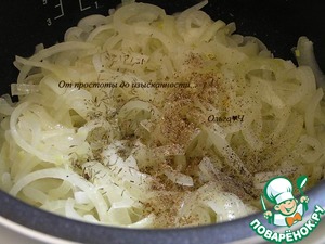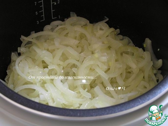 Лук нарежьте полукольцами. Выложите в чашу мультиварки, добавьте соль, полейте растительным маслом, перемешайте.