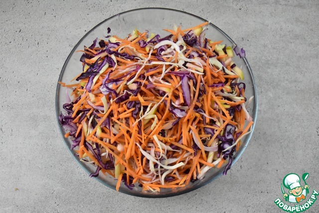 Морковь натрите на терке для корейских салатов. Нарежьте перьями красный лук и соломкой яблоко.