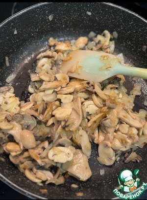 Обжарить мелко нарезанный лук и нарезанные шампиньоны до красивого золотистого цвета, посолить, поперчить по вкусу