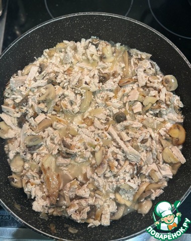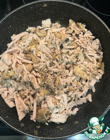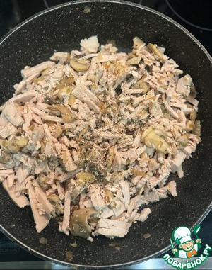 Добавить на сковороду заранее отваренное, мелко нарезанное, мясо филе индейки, слегка обжарить