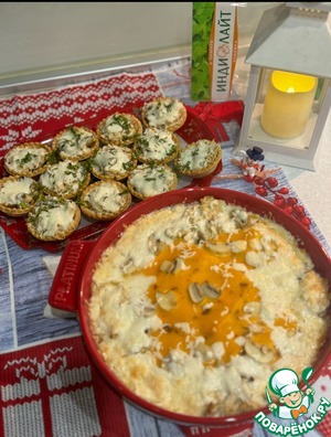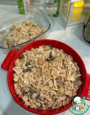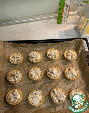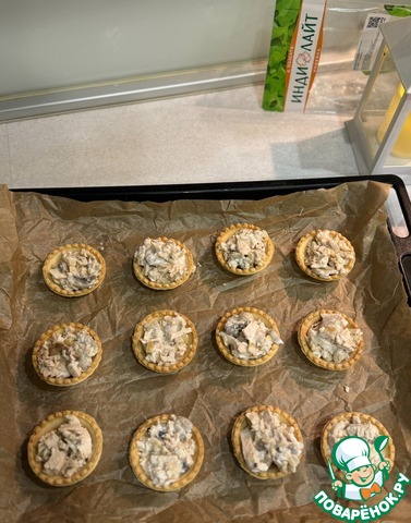 БОльшую часть начинки выложить в общее блюдо для запекания, вторую часть начинки оставить для тарталеток