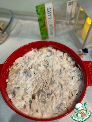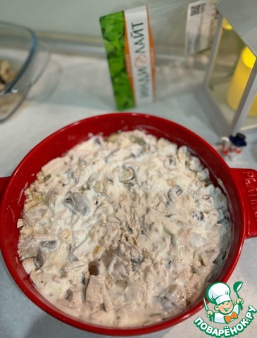 Начинку в общем блюде смазать греческим йогуртом ( майонезом)