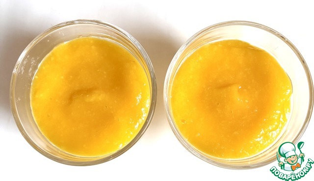Разложить пюре манго по стаканчикам. Можно приготовить в бокалах, будет выглядеть празднично.