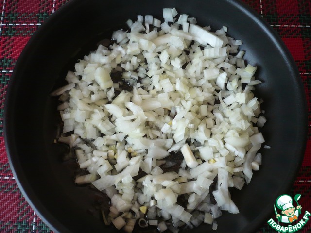 В сковороду наливаем небольшое количество растительного масла, разогреваем и высыпаем лук, нарезанный на мелкие кубики. Обжариваем его до прозрачности.