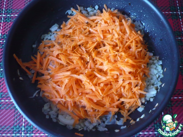 Затем к луку добавить морковь, натёртую на крупной тёрке. Жарим, периодически помешивая, 5-7 минут, до мягкости и лёгкого золотистого цвета.
