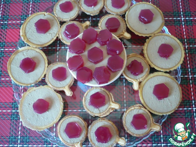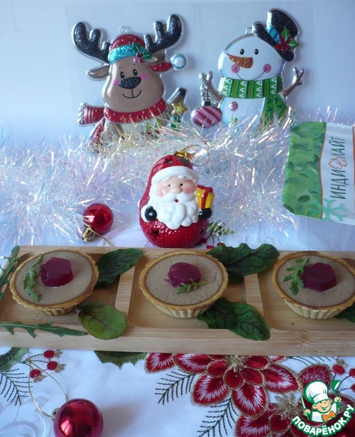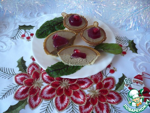 Через полчаса раскладываем паштет по тарталеткам и сверху кладём по кусочку застывшего гранатового желе. Выглядит такая закуска очень красиво и замечательная по вкусу.