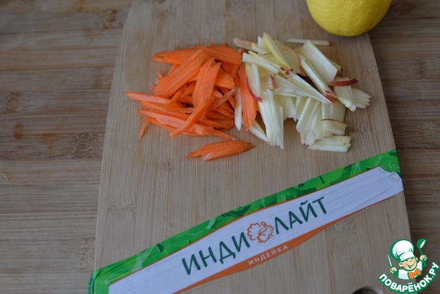 Морковь и яблоко режем тонкими полосками или трём на тёрке для корейской моркови. Яблоко сбрызгиваем соком лимона. Кладём к индейке.