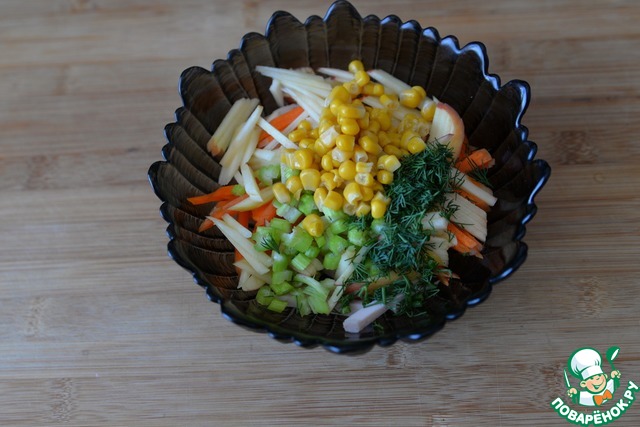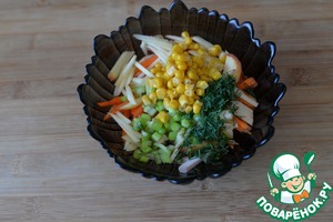 Добавляем в салат, порезанный сельдерей, укроп и кукурузу.