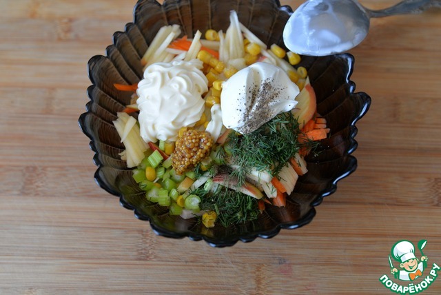 Добавляем в салат соль, перец, горчицу, йогурт, или смесь йогурта и майонеза, или сметану. Перемешиваем салат.