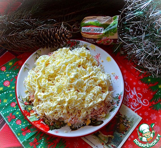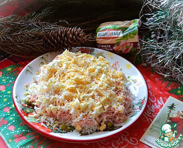 Без салатов праздничные столы скучные. Уважающая себя хозяйка, обязательно приготовит не меньше трёх, а то и больше, точно. Рекомендую быстрый, но интересный салатик. За счёт такой нарезки, он нежный, не требуется время на пропитывания слоёв. Поддержим зимнюю новогоднюю тему и за столом.