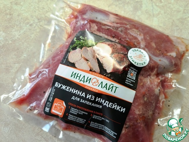 - Индейка (Буженина из индейки ТМ Индилайт (готовый полуфабрикат для запекания)) — 800 г
