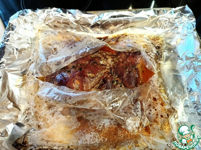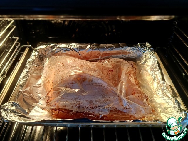 Поставить мясо в разогретую духовку до 160-170 градусов примерно на 1,5 часа.