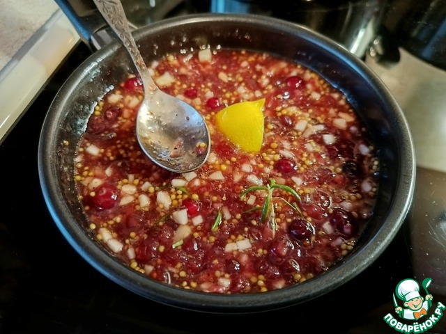 В сотейнике смешать клюквенное варенье, яблоко, зерновую горчицу. Добавить ароматные травы, розмарин. -