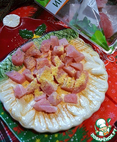 Индейку нарезать кубиком, добавить специи, перемешать.