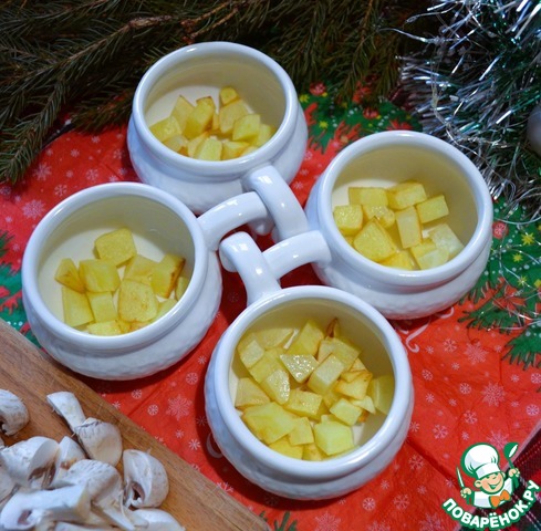 Картофель слить, подсушить на бумажном полотенце, обжарить в хорошо разогретом масле. В жаропрочные порционные формочки разложить картофель.