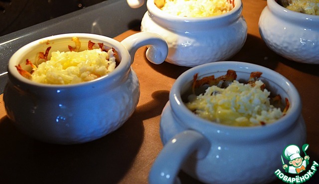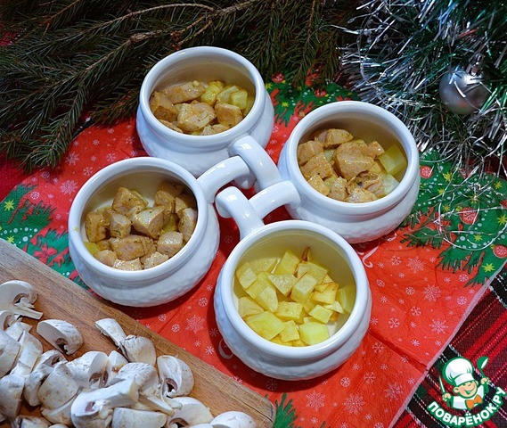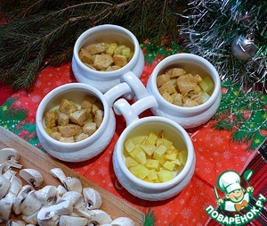 Обычная запеканка на скорую руку - картофель, грибы, индейка и сыр..., много сыра. Отличный вариант горячего для праздничного стола, красивая порционная подача понравится всем. Рекомендую.