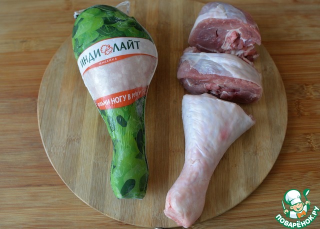 • Для приготовления кассуле берём голень индейки. У меня - Индилайт. Индейку рубим на порционные куски, у меня - три.