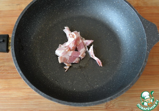 • На горячую сковороду наливаем масло, кладём порезанный бекон. Обжариваем бекон до вытапливания жира.