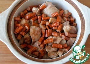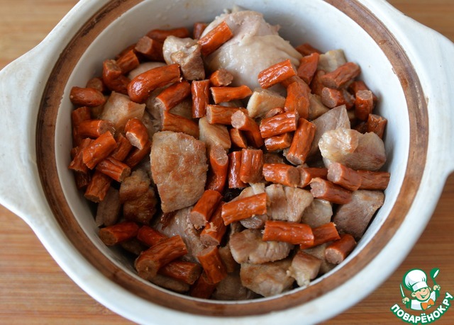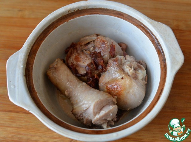 • Берём горшок, в котором будем томить кассуле, кладём в него обжаренные голени вместе с беконом.
