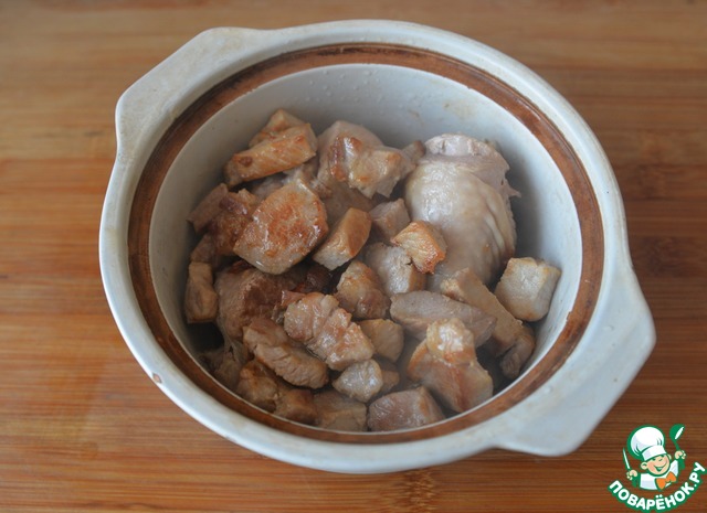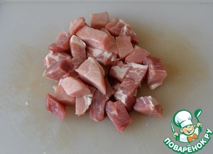 • Свинину режем кубиками, обжариваем на максимальном огне до золотистости около 5 минут.