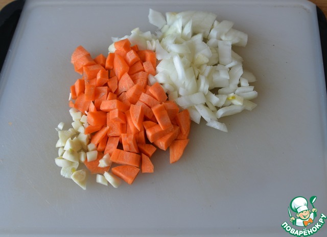 • Морковь, лук и чеснок чистим. Морковь режем кубиками или брусочками, лук кубиками, чеснок мелкими кубиками.
