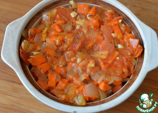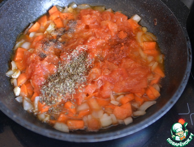 • На сковороду добавляем масло, обжариваем лук и морковь до полу-мягкости на среднем огне, около 10 минут, добавляем чеснок, заливаем томатами в собственном соку. Добавляем соль, перец чёрный молотый, перец кайен, прованские травы, соль. Перемешиваем, тушим на среднем огне 5 минут.