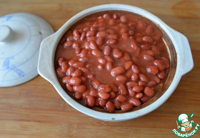 • Сверху кладём фасоль. Фасоль можно брать консервированную или самим сварить. Можно брать белую или красную, можно смесь. У меня красная фасоль в томатном соусе. Горшочек закрываем. Ставим на 200 градусов в духовку на 1,5 часа. За полчаса за окончания приготовления, открываем крышку, чтобы сверху на кассуле образовалась запечённая корочка.