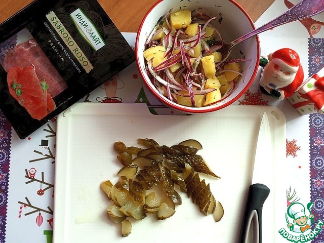 Теперь нарезаем огурец солёный. У меня бочковой. Конечно можно заменить его маринованным, если нет солёного. Отправляем огурец в салатник. Перемешиваем.