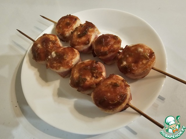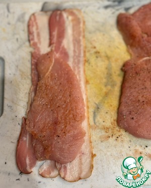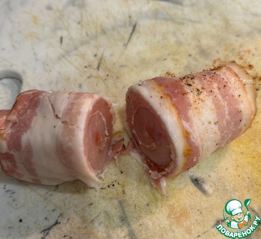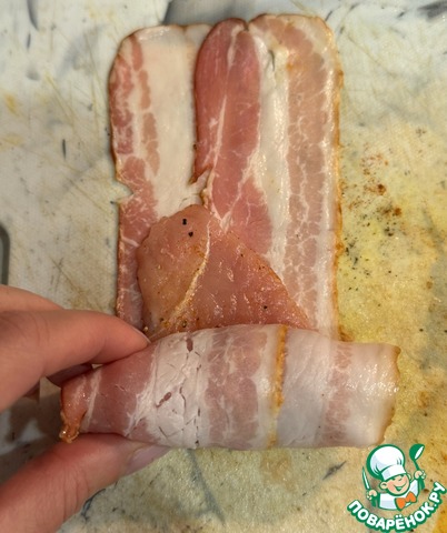 На две пластинки бекона выложить мясо птицы