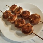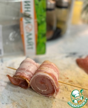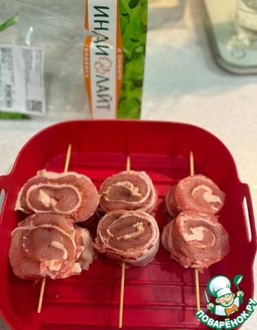 Обе части рулета надеть на шпажку, предварительно замоченную в воде, для того, чтобы предотвратить возгорания при приготовлении пищи на высоких температурах (для данного количества продуктов понадобится 6 шпажек)